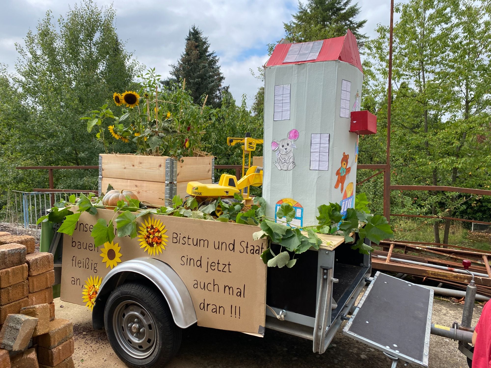 Mehr als 50 Personen waren dem gemeinsamen Aufruf von Kindergarten und Förderverein gefolgt und bildeten eine eindrucksvolle Gruppe. Nicht nur das aufwendig gestaltete Gespann, sondern auch die Arbeitskleidung der Kinder und Erwachsenen zeugten von der Einsatzbereitschaft der Beteiligten und sorgten für viel positive Resonanz. Wir hoffen, dass unsere Wünsche bei den Verantwortlichen bald Gehör finden.